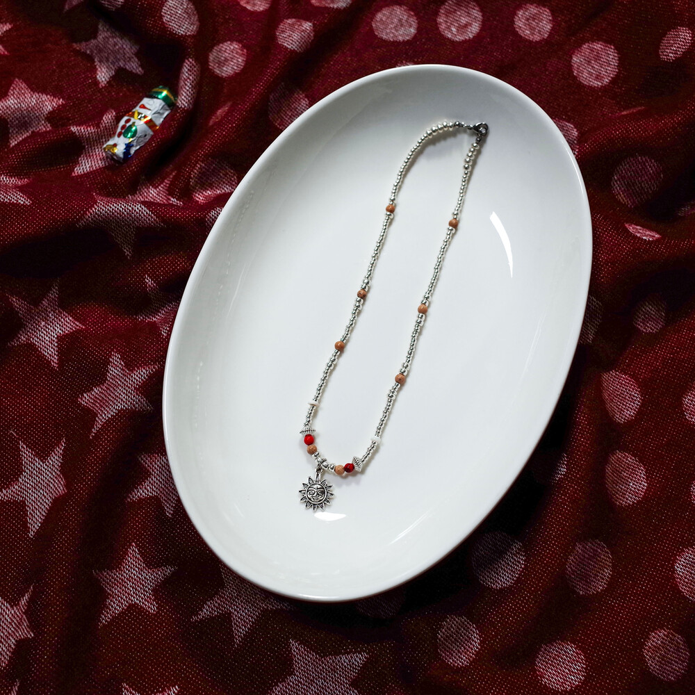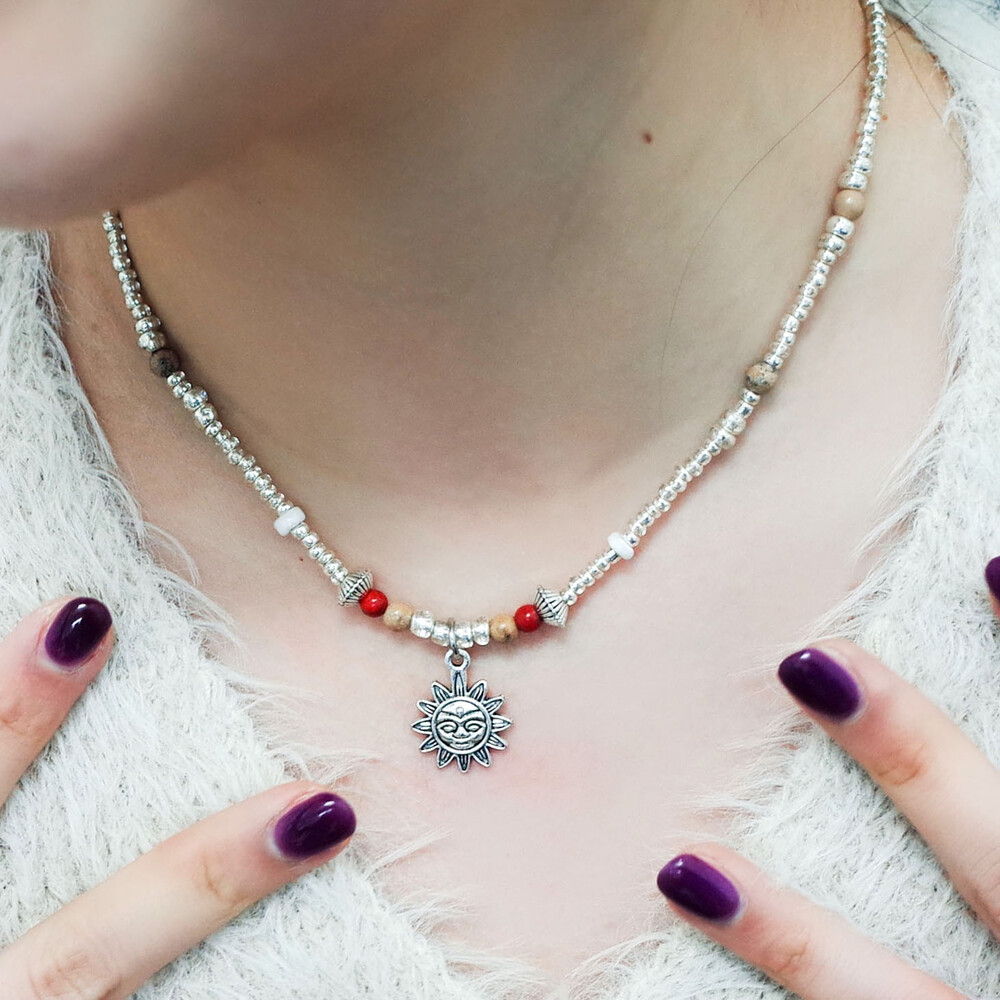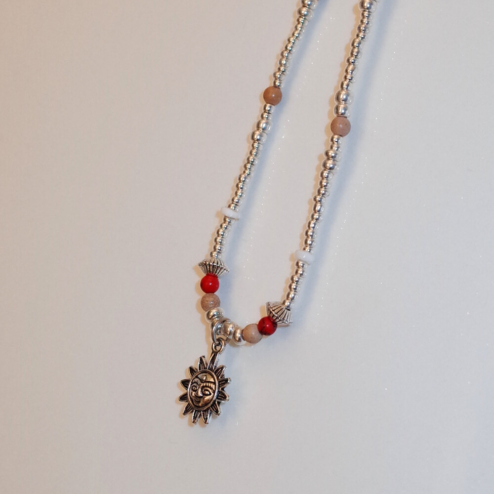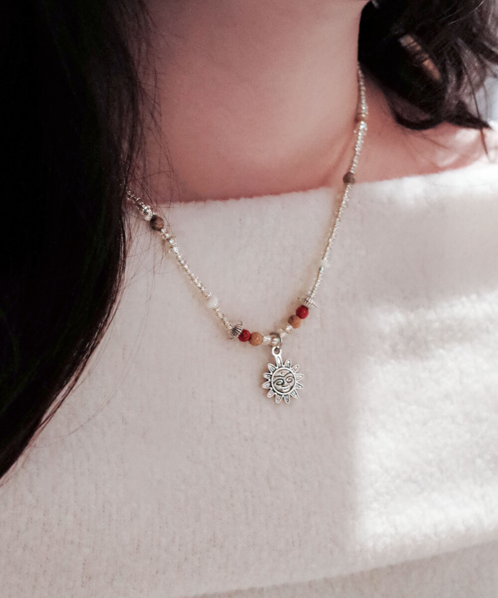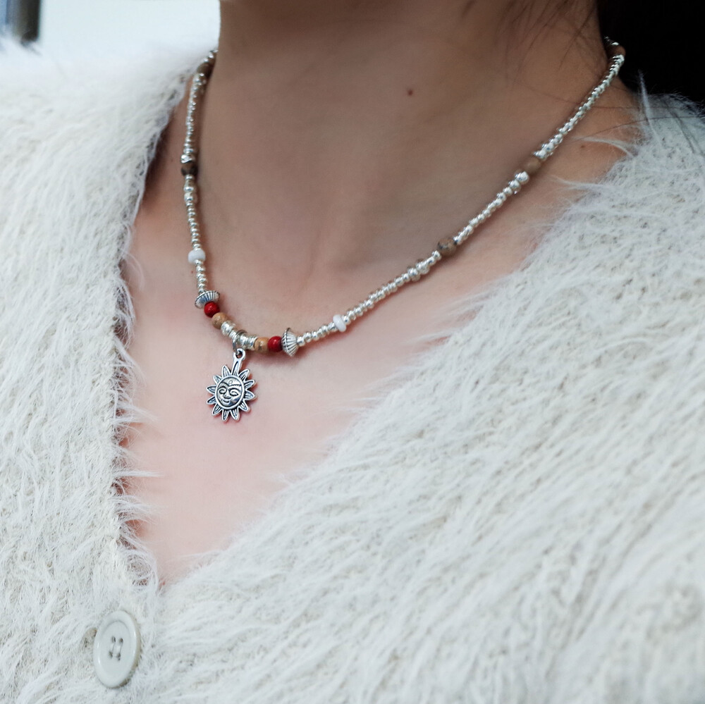 귀여운 얼굴 모양 해님 참이 달린 실버 목걸이입니다.