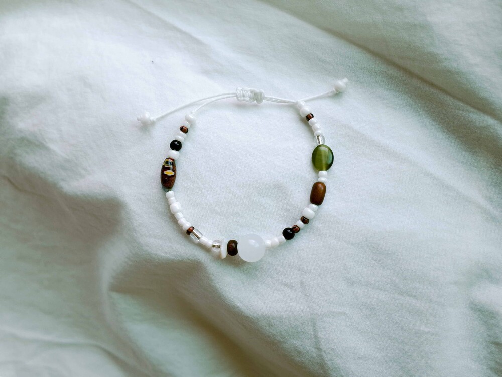 톤 다운된 그린컬러 원석 비즈, 우드 비즈, 화이트 컬러비즈를 조화롭게 엮어