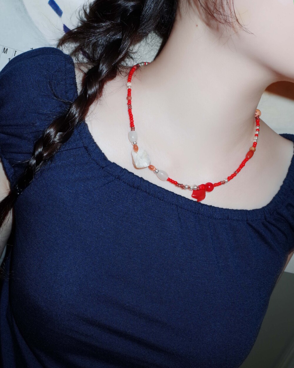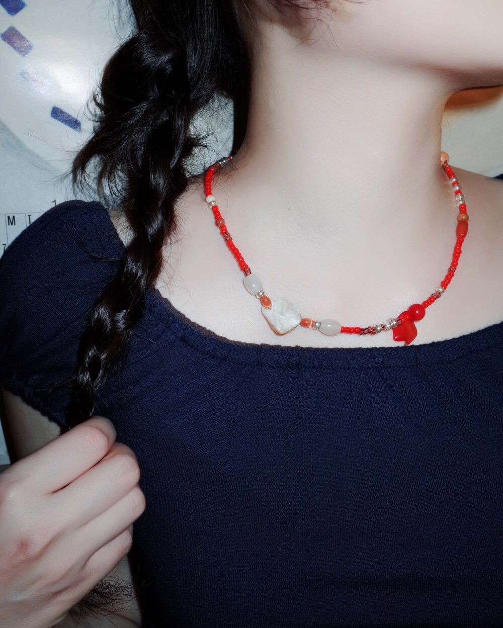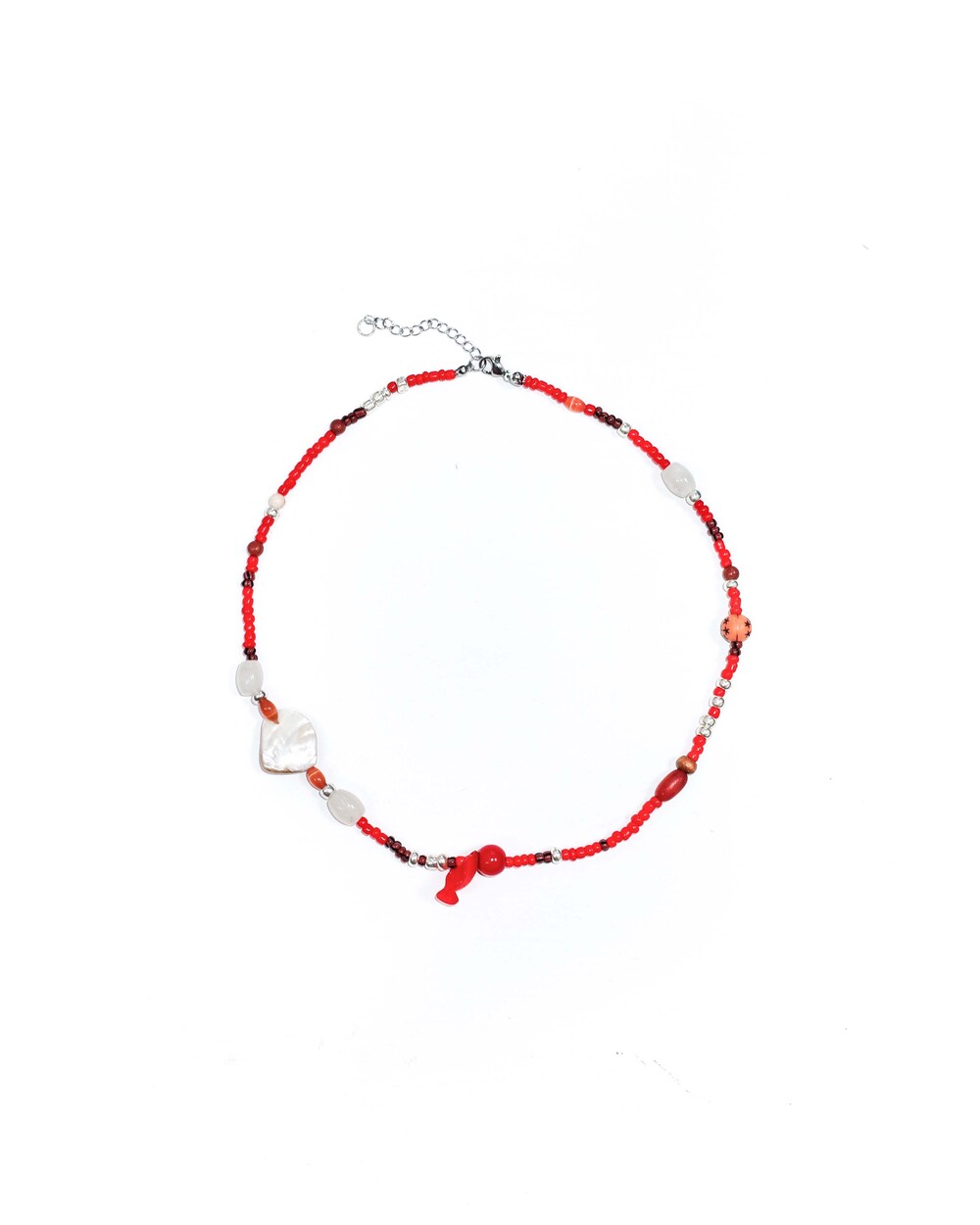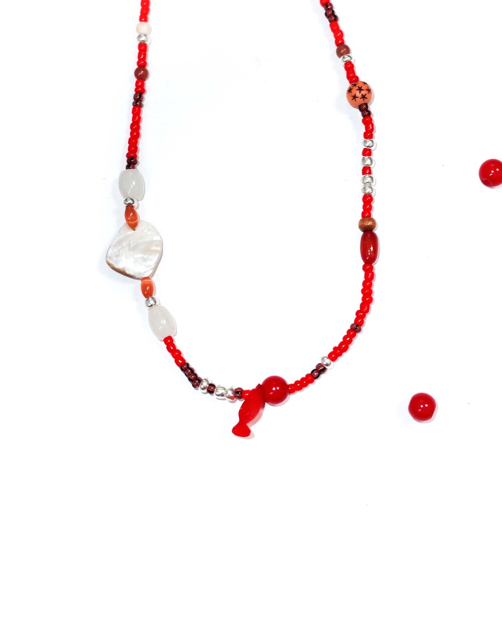 선명한 빨간 베이스 비즈를 중심으로, 조개 비즈, 원석 비즈, 그리고 나무 비즈를 자연스럽게 엮어 만든 목걸이예요.