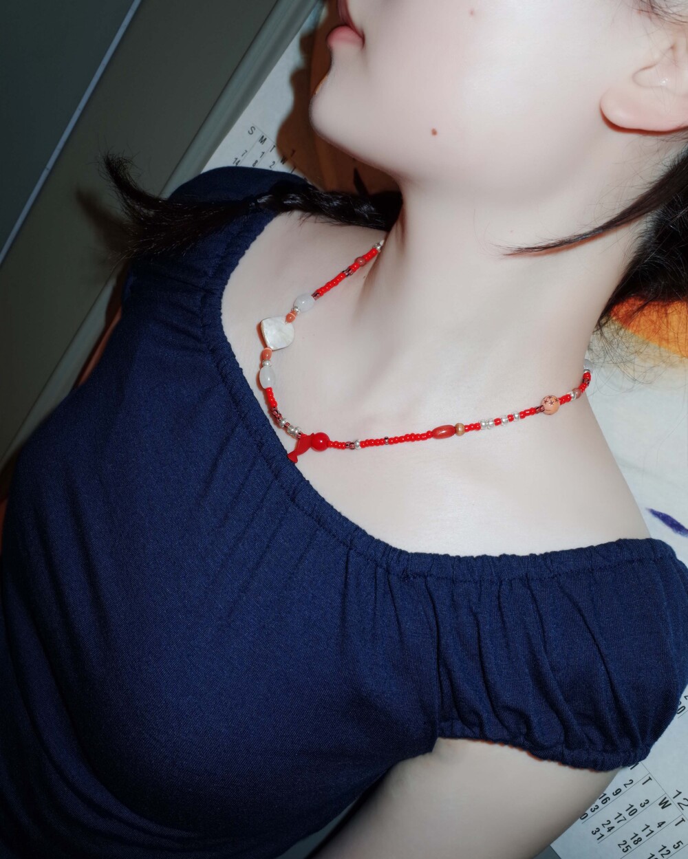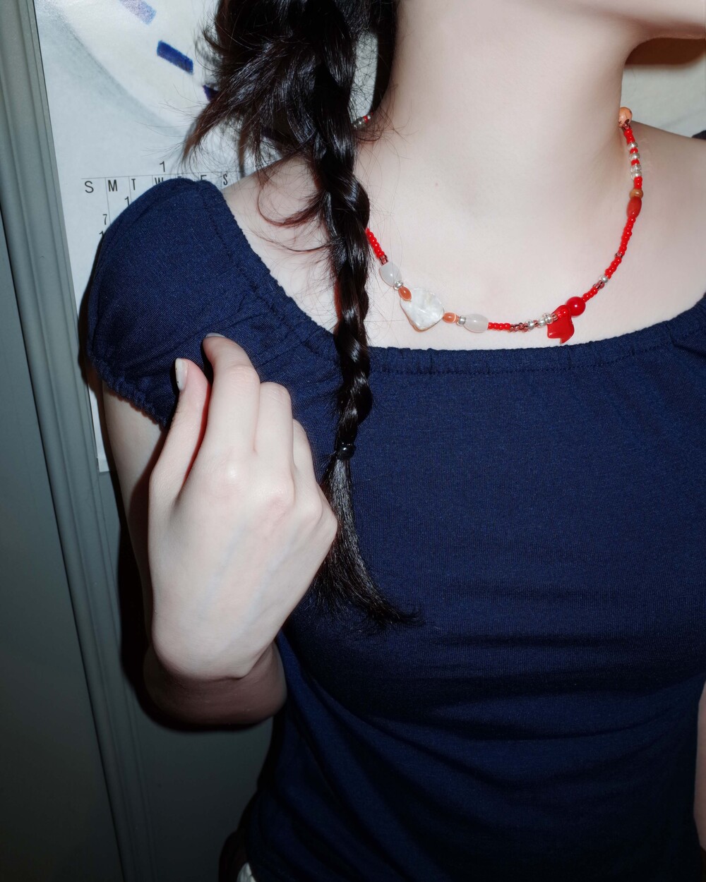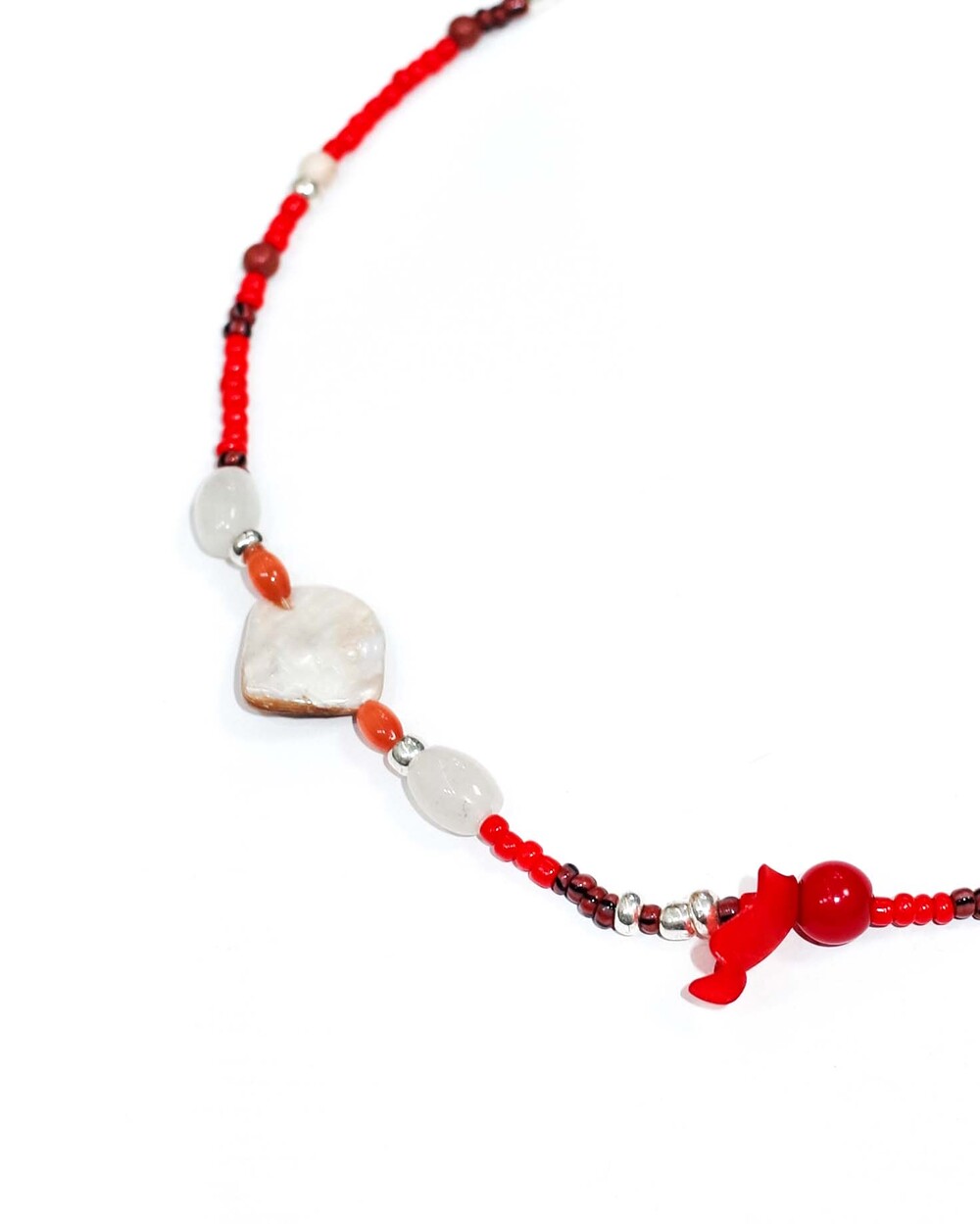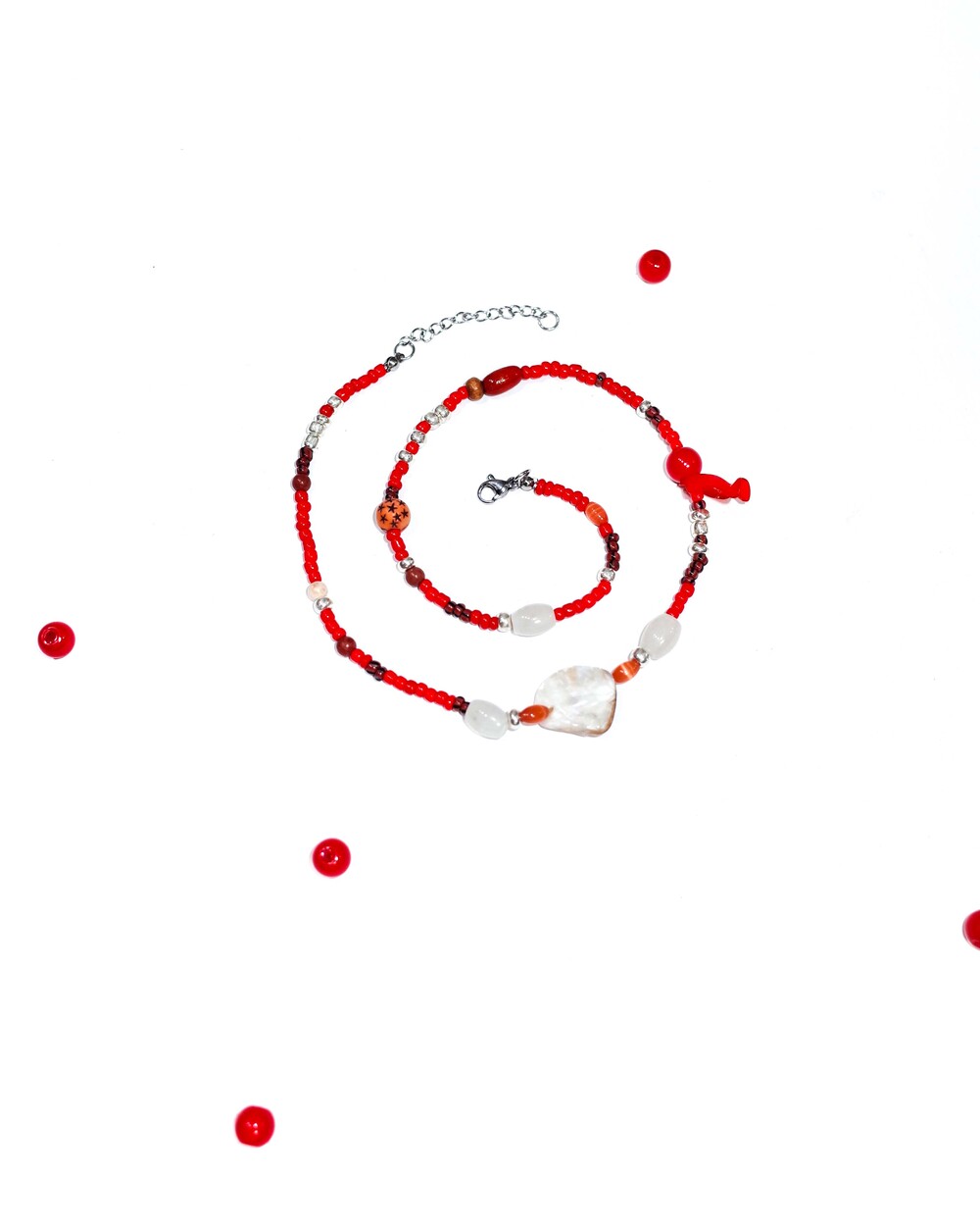 선명한 빨간 베이스 비즈를 중심으로, 조개 비즈, 원석 비즈, 그리고 나무 비즈를 자연스럽게 엮어 만든 목걸이예요.