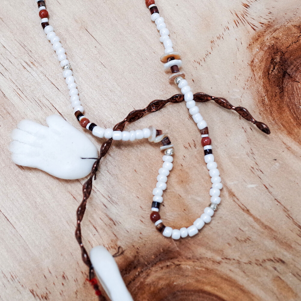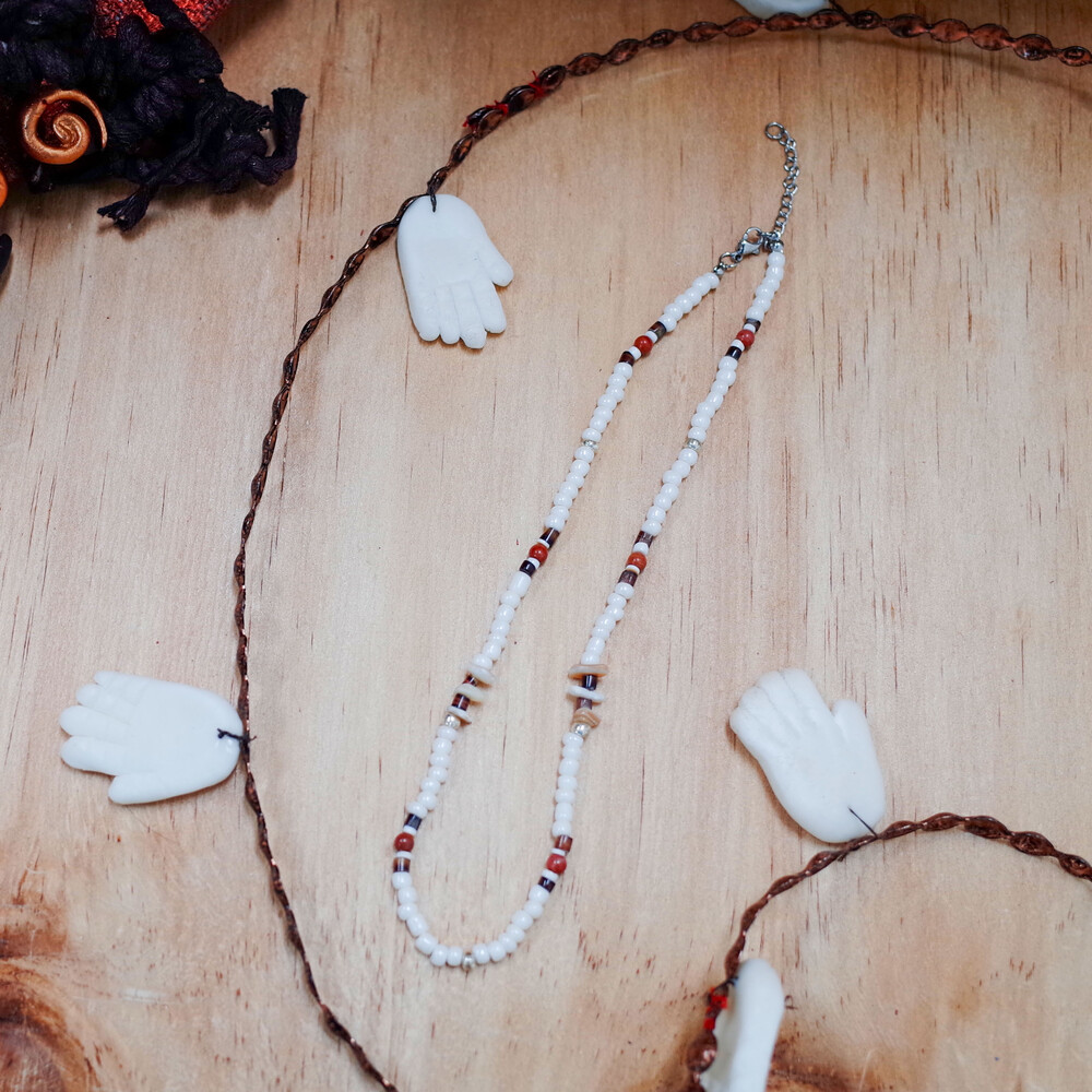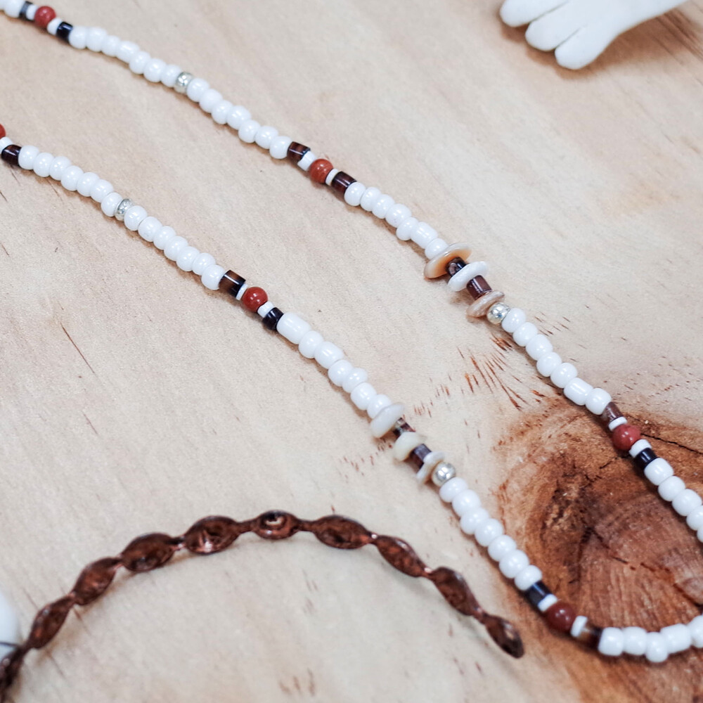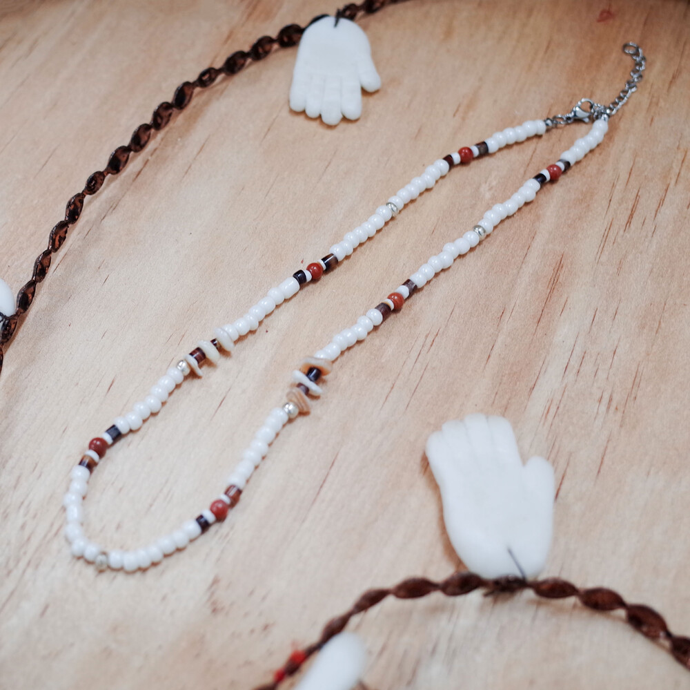 중간 중간 갈색과 흰 조개 비즈로 패턴이 들어갔어요.