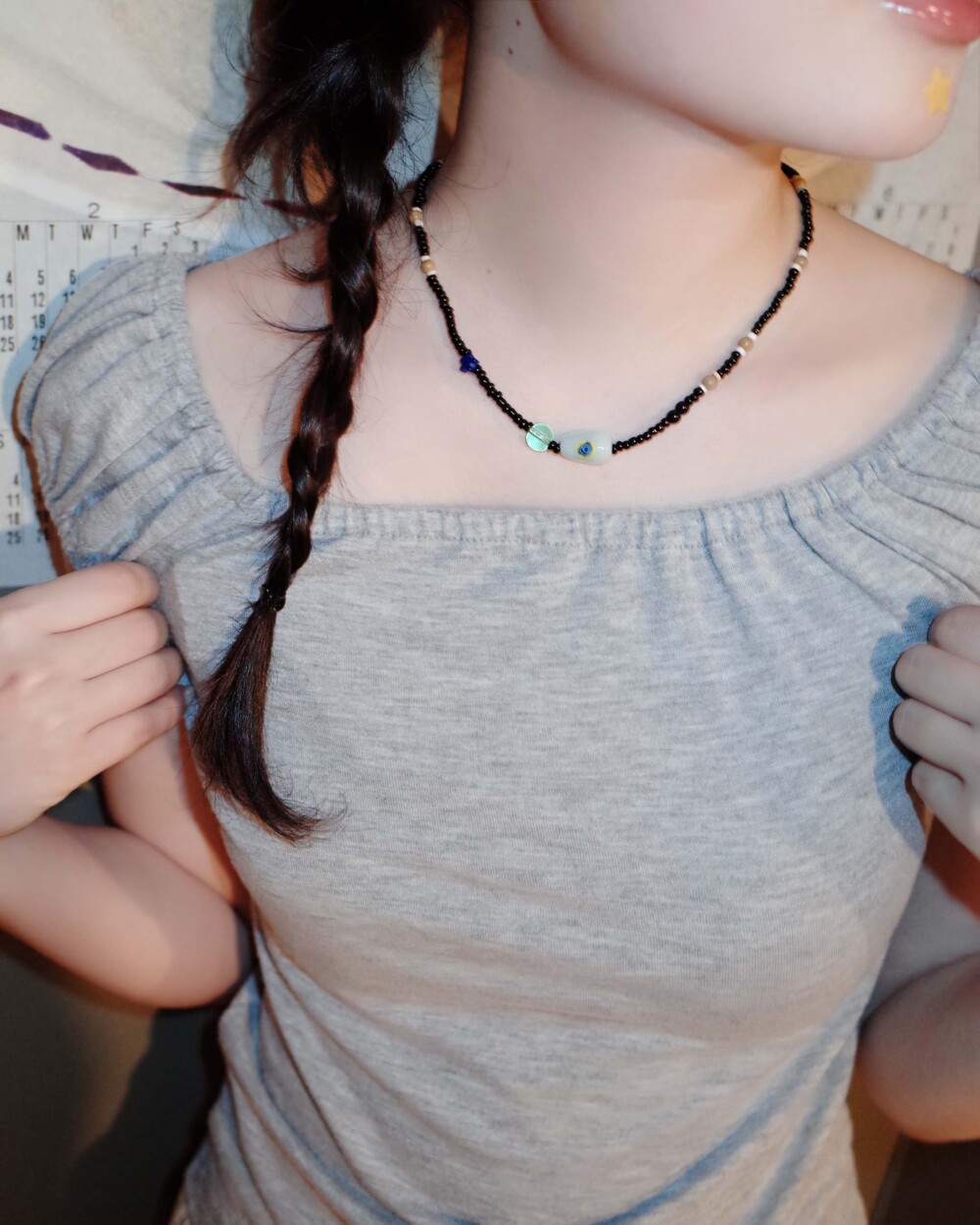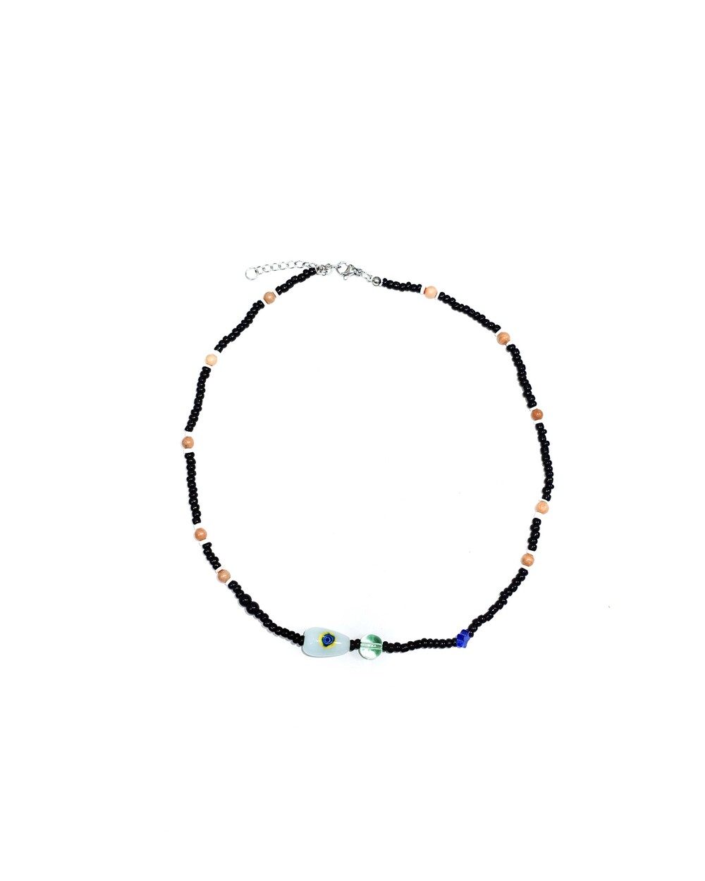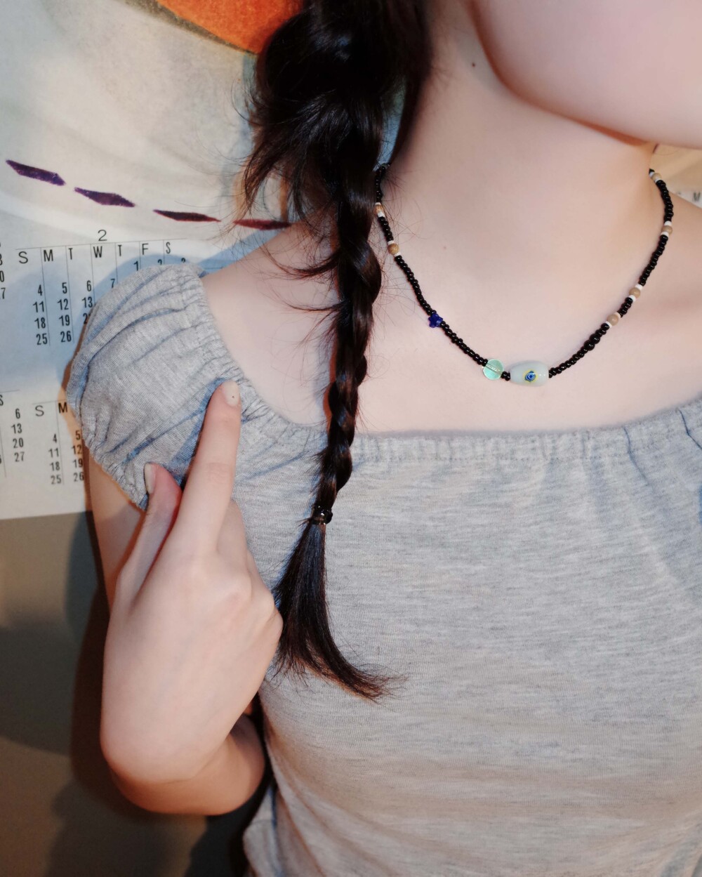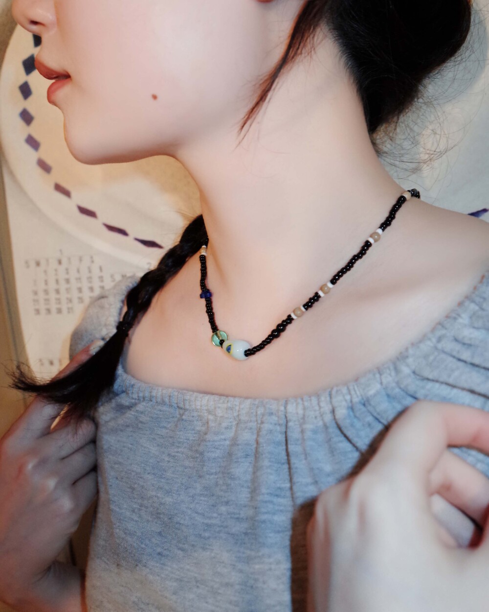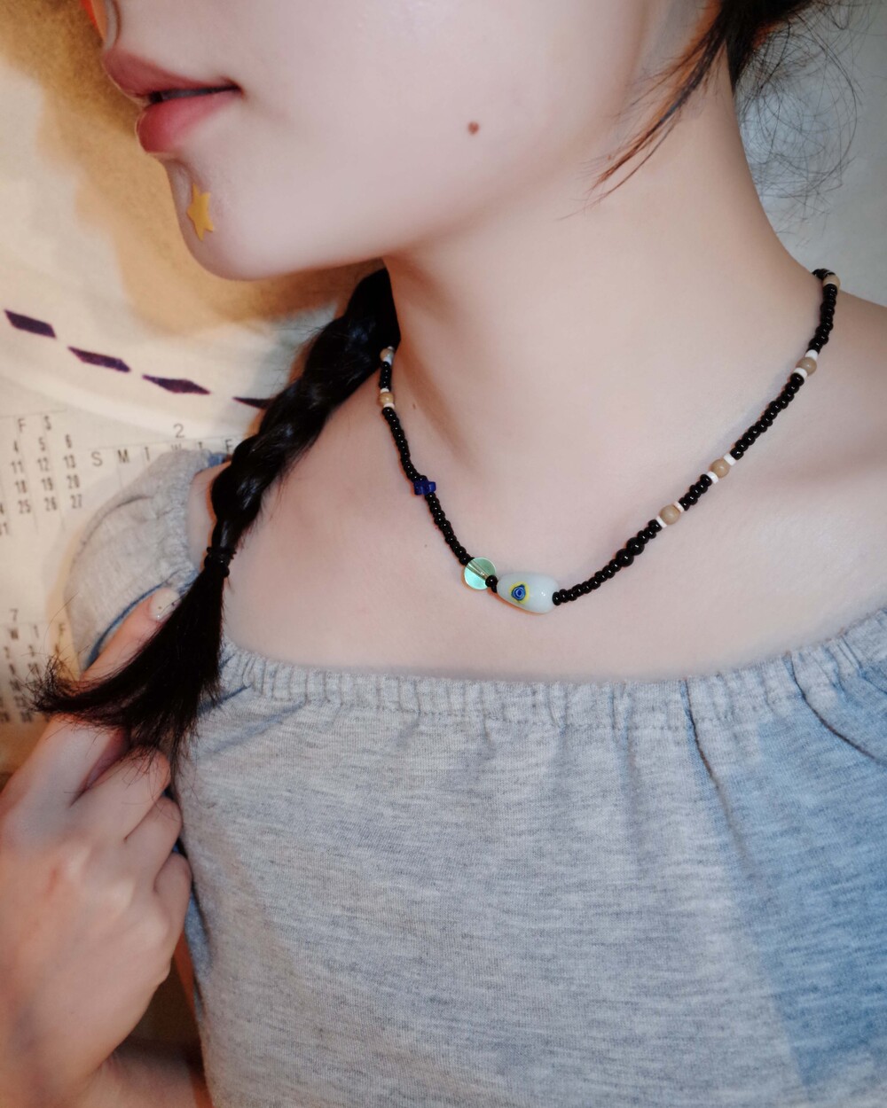 검정 베이스 비즈에 원석 비즈, 조개 비즈로 이루어진 목걸이예요.