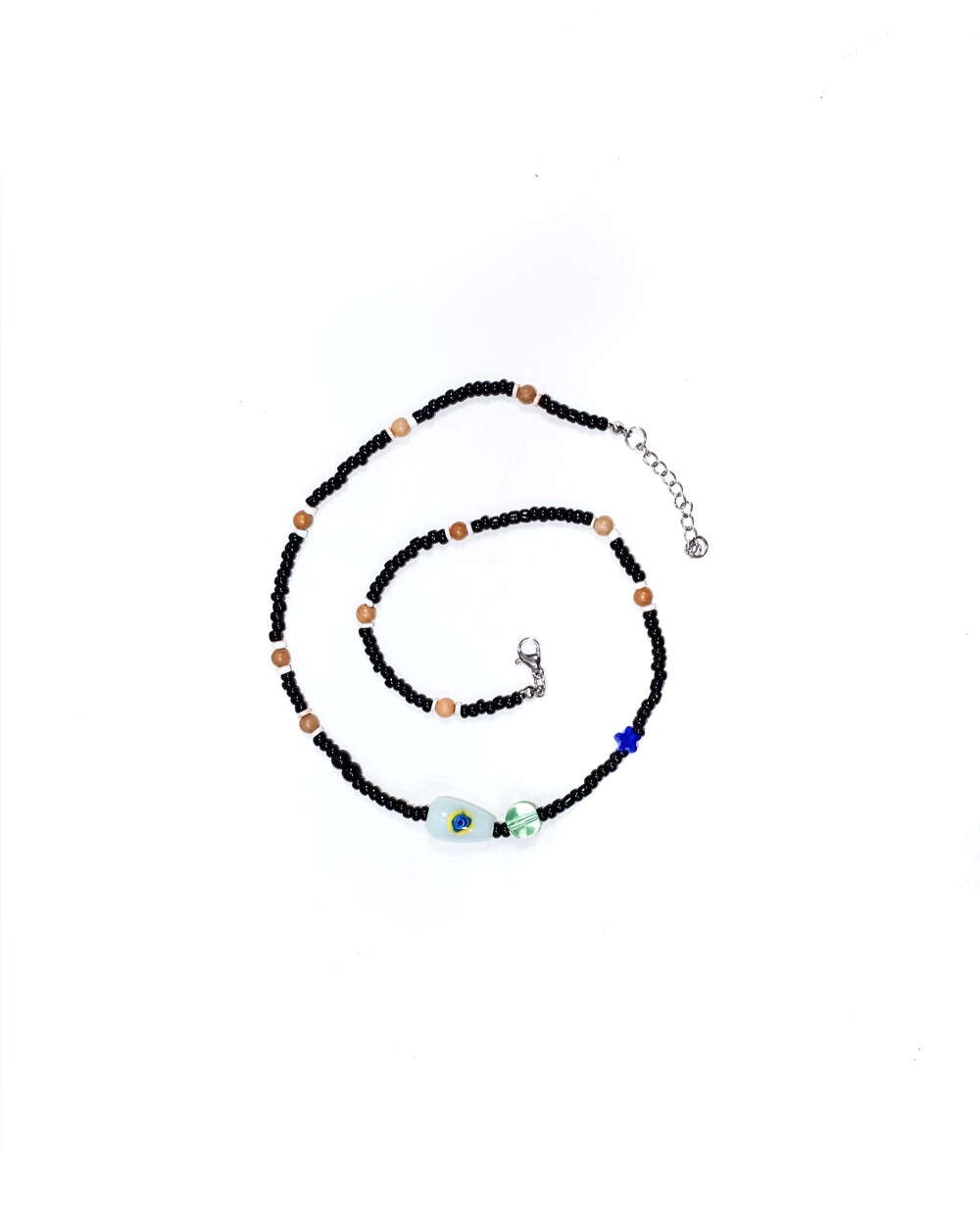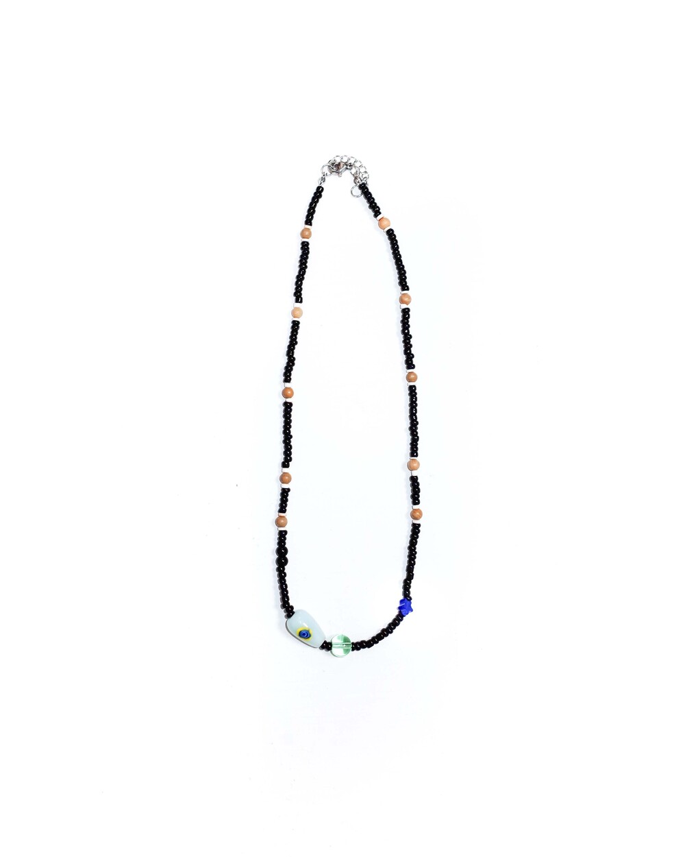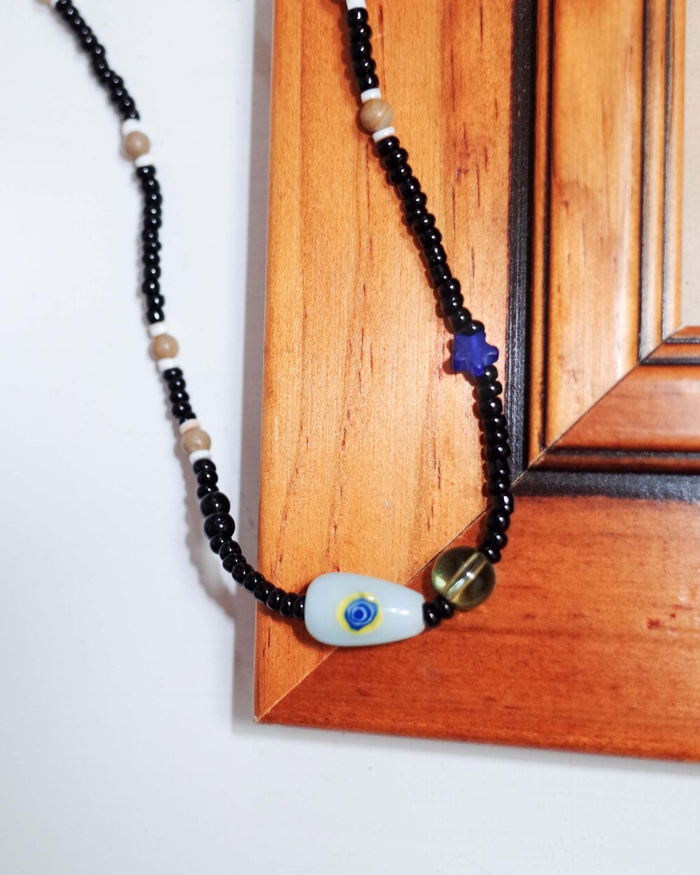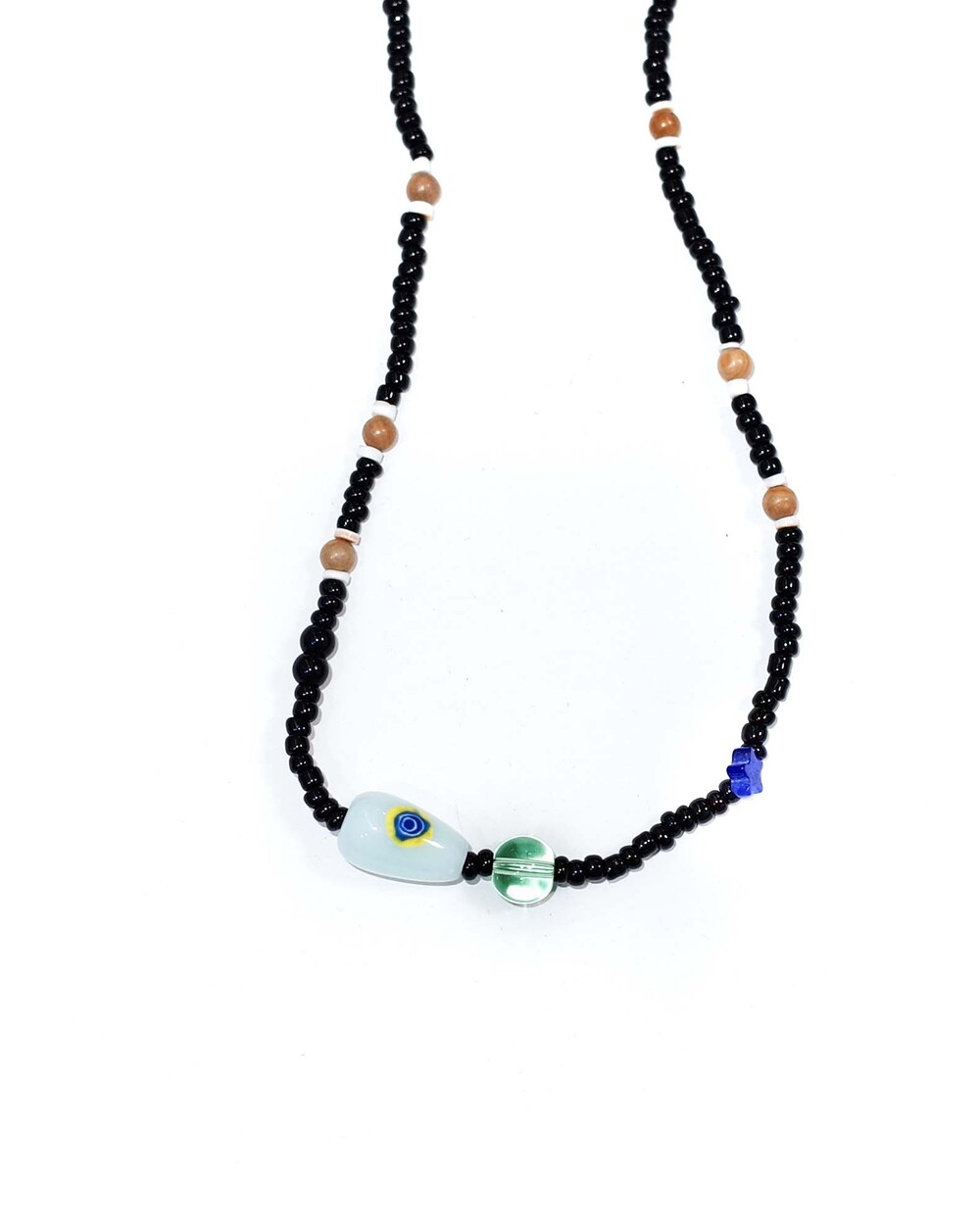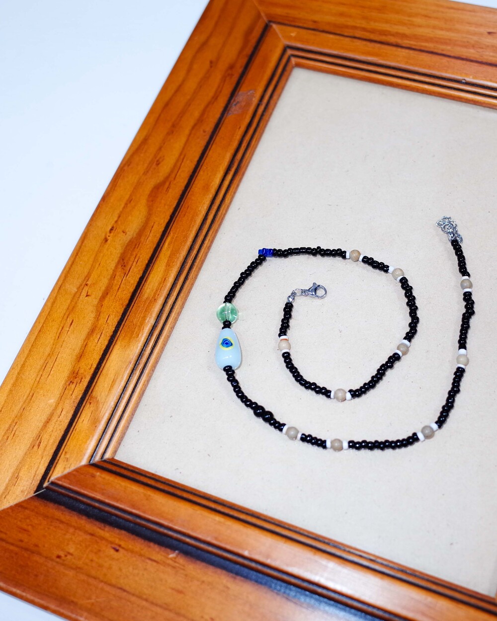 검정 베이스 비즈에 원석 비즈, 조개 비즈로 이루어진 목걸이예요.
