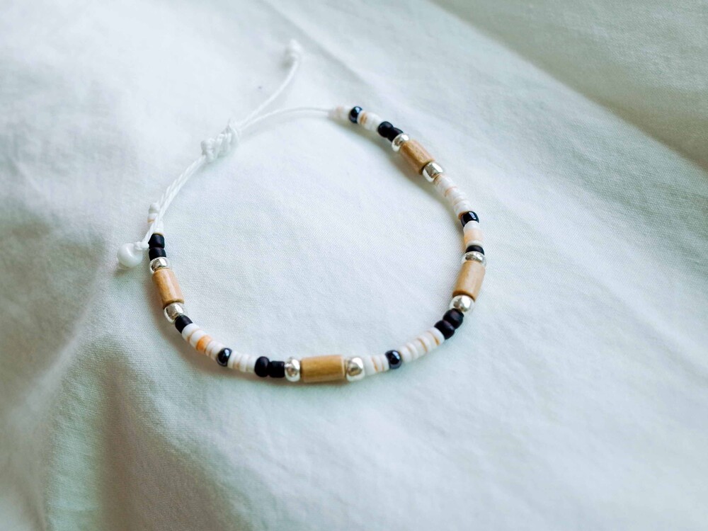 실버, 블랙, 산호 비즈와 우드 비즈를 일정한 패턴으로 엮어 제작했어요.